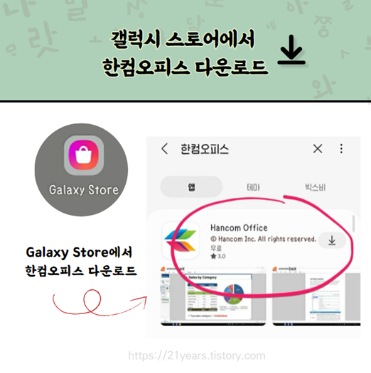 한컴오피스를 검색하면 다음과 같은 앱이 뜨게 되는데요. 갤럭시 스토어에서만 무료이므로 마음 편하게 설치해주면 됩니다. 설치하실 때 저장 공간 (필수) 접근 권한은 허용하셔야 합니다.