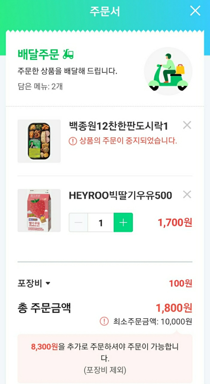 원하는 상품들을 골라 장바구니에 넣어준 뒤 최소 주문 금액 이상을 주문해주면 되는데요. 이용 방법은 간단한 편이지만, 단점은 품절 상태인지 기재가 안 되어 있다는 것입니다. 저도 도시락을 장바구니에 넣고 나서야 품절되었다고 알림이 뜨네요. 이 점 유의하셔서 고르시면 될 것 같습니다.
