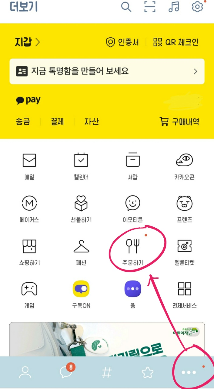 카카오톡 앱에 들어가게 되면 하단 메뉴에 점 세 개로 된 설정 버튼이 있죠? 거기를 누르면 내 지갑 잔액과 카카오 페이 송금 버튼 등 여러 기능들을 익숙하게 봐오셨을 텐데요. 밑에 메뉴 중 <주문하기> 눌러주면 됩니다.