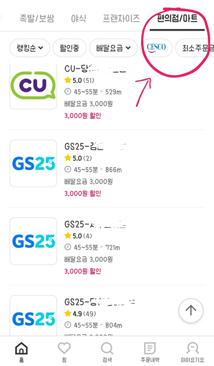 그러면 집 근처에 딜리버리 가능한 지점들이 여러 곳 뜨게 되는데요. 지역마다 차이가 있으니 참고해주세요. 이미지를 보시는 것처럼 GS25, 세븐일레븐, CU 배달이라고 마크가 뜨는 것을 확인한 뒤에 원하는 곳을 눌러주면 됩니다.